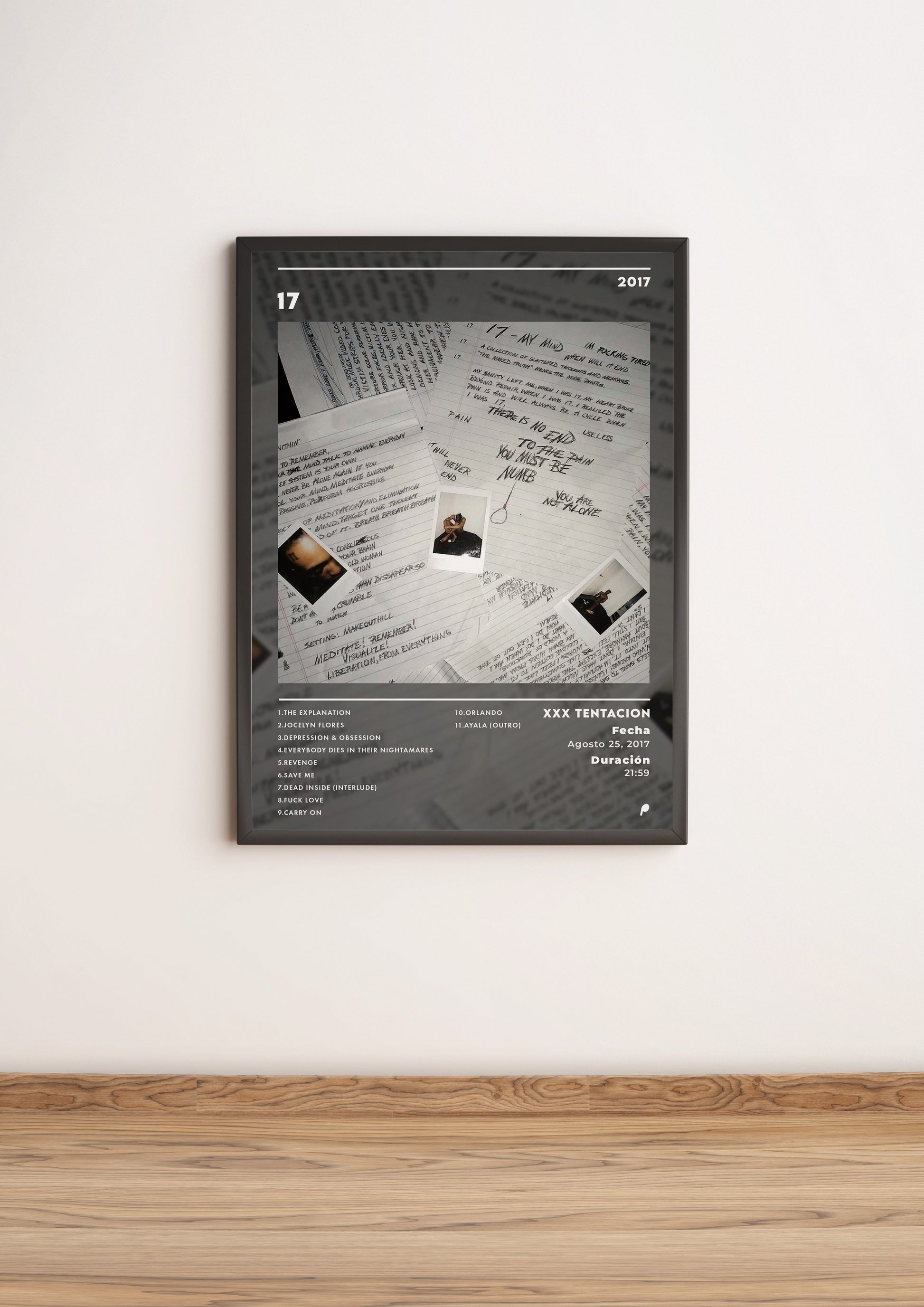 Sumérgete en la intensidad emocional y la introspección profunda con este póster inspirado en el álbum "17" de XXX Tentacion. Impreso en papel de alta calidad de 250g/m², captura la esencia cruda y auténtica de las notas manuscritas y fotografías personales que reflejan el caos interno y la vulnerabilidad del artista. Una pieza ideal para quienes buscan conectar con una expresión sincera y emocional, perfecta para darle un toque original y personal a cualquier espacio de tu hogar.