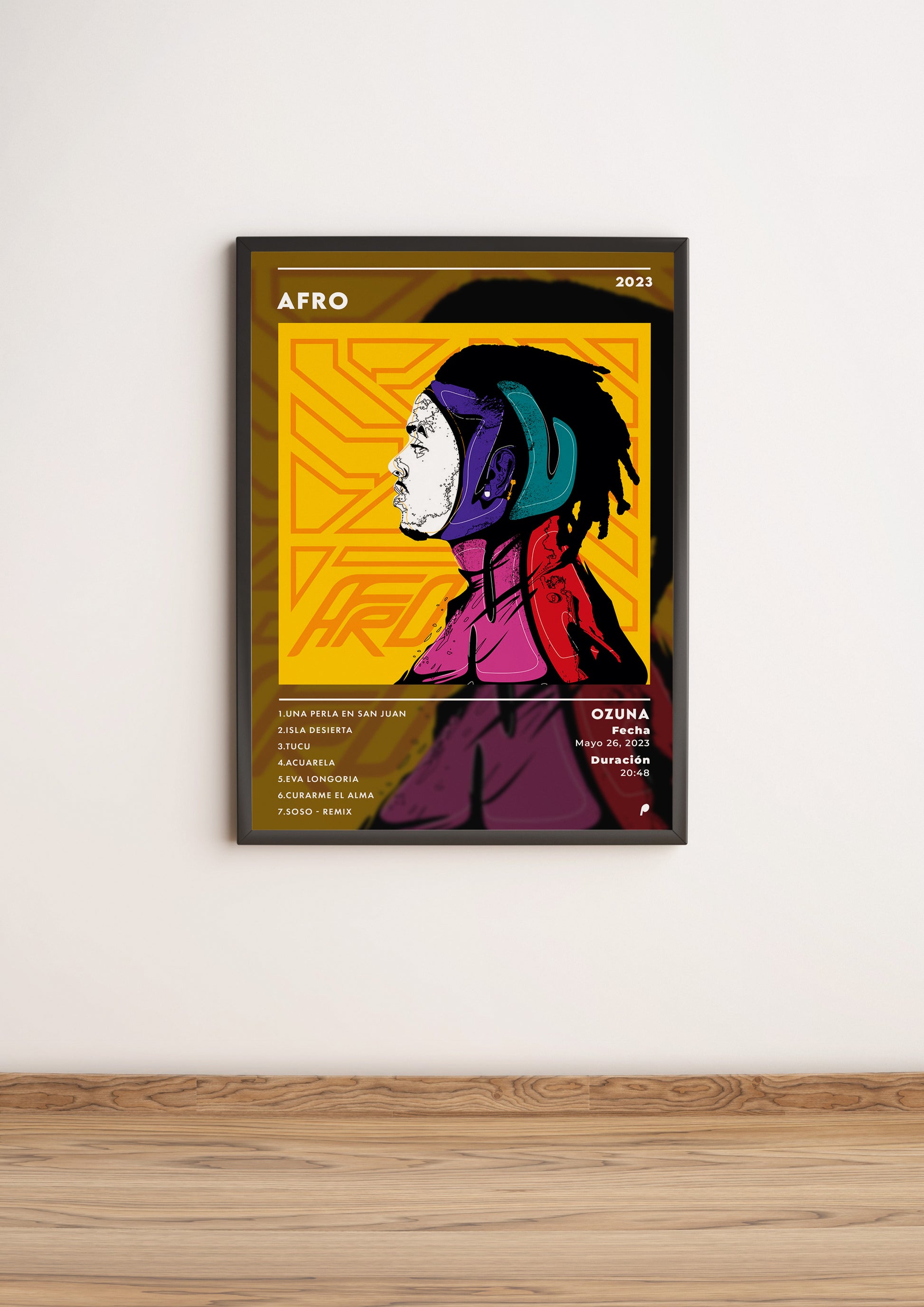 Añade un toque vibrante y moderno a tu espacio con este póster inspirado en el álbum "AFRO" de Ozuna. Impreso en un póster de 250g/m² y enmarcado en policloruro de vinilo con un interior reforzado de aluminio y cristal, esta pieza destaca con sus colores vivos y diseño detallado que refleja la energía y el estilo único del artista. Perfecto para quienes buscan una obra de arte que aporte color y personalidad a cualquier rincón del hogar, oficina o estudio, ideal para los amantes de la música urbana y el arte contemporáneo.