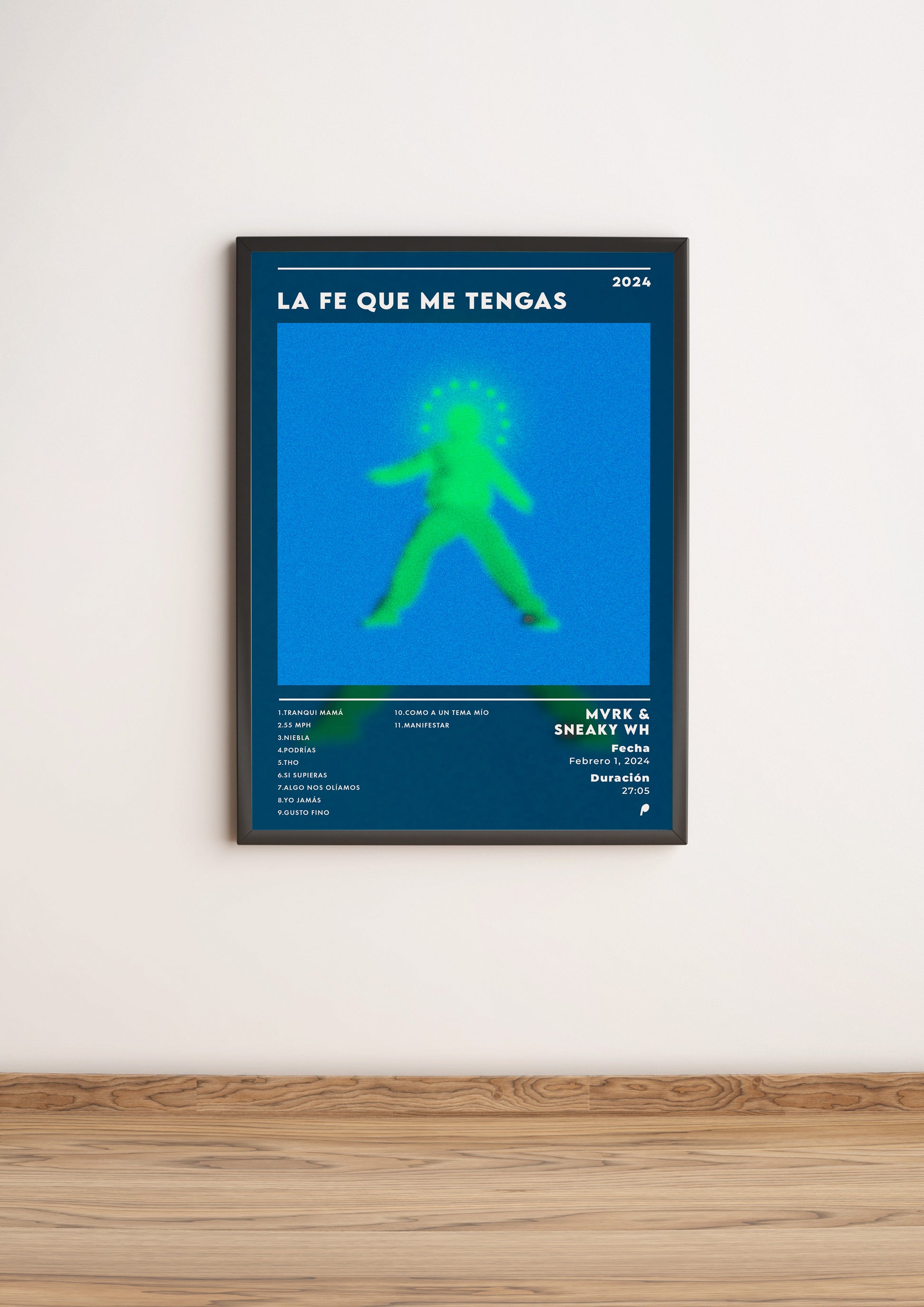 Aporta un aire místico y contemporáneo a tu espacio con este póster inspirado en el álbum "La Fe Que Me Tengas" de MVRK & SNEAKY WH.\n- Impreso sobre un papel de alta calidad de 250g/m², esta pieza presenta una figura difuminada y vibrante que evoca una sensación de espiritualidad y energía positiva.\n- Ideal para quienes buscan decorar su hogar o estudio con una obra de arte que combine modernidad y profundidad emocional, transmitiendo una atmósfera única y cautivadora.