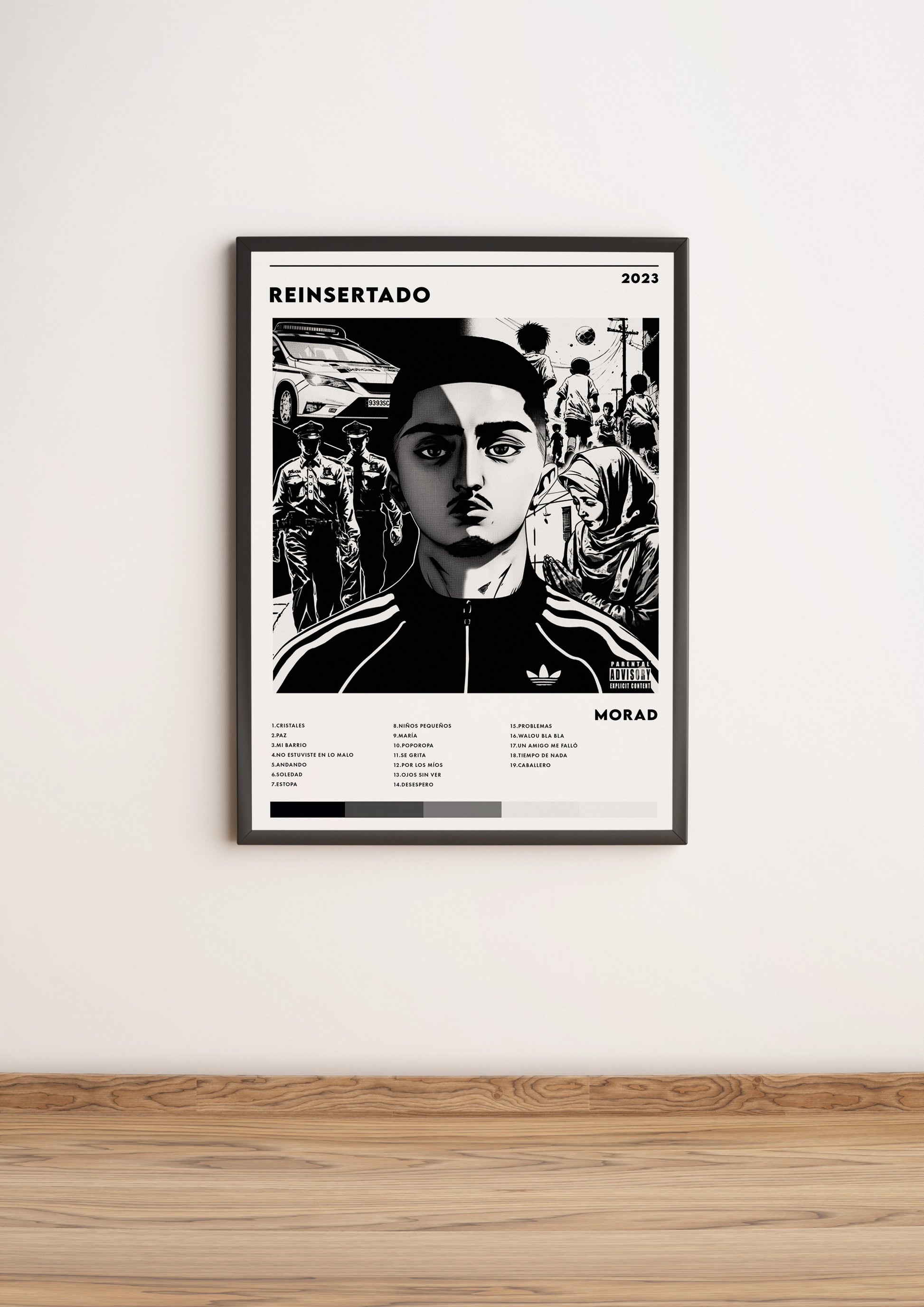 Añade un poderoso impacto visual a tu espacio con este póster inspirado en el álbum "Reinsertado" de Morad. Impreso en alta calidad sobre papel de 250g/m² y enmarcado en policloruro de vinilo con un interior reforzado de aluminio y cristal, esta pieza en blanco y negro presenta un estilo gráfico realista con una fuerte narrativa social y urbana. Perfecto para quienes buscan arte que combines fuerza, cultura y un mensaje profundo, ideal para decorar cualquier espacio que necesite un toque dramático y significativo.